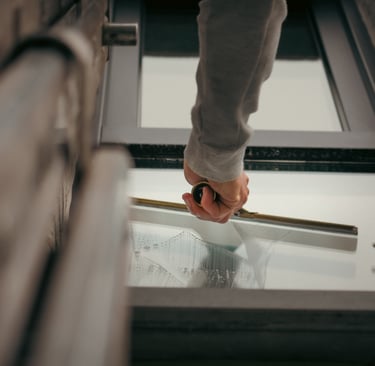 Nous travaillons uniquement avec du matériel pro : eau purifiée, raclettes haut de gamme, microfibres et perches longue portée.